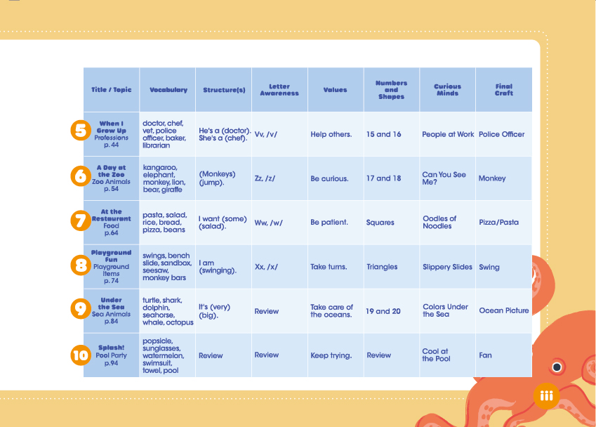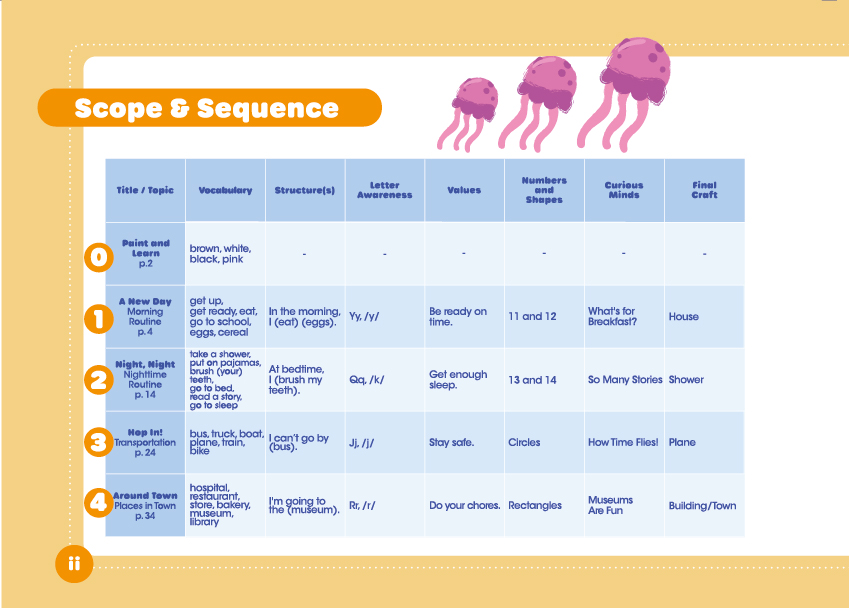 Un libro de enseñanza de inglés como segundo idioma o idioma extranjero para tercero de preescolar. El libro está enfocado en formar las bases de la lectoescritura con historias, vocabulario, valores, canciones y mucho más.
