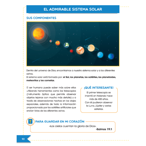 Este libro está diseñado para llevar a los alumnos a conocer y descubrir aspectos fascinantes de la creación de Dios. Los estudiantes aprenderán sobre temas como el sistema solar y el increíble funcionamiento del cuerpo humano, complementado con ejercicios, experimentos y datos interesantes que refuerzan el aprendizaje y despiertan el interés.