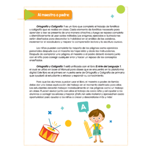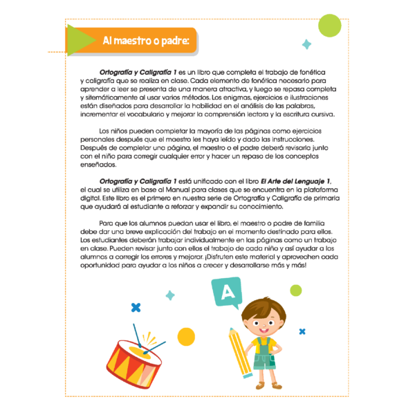 Un libro complementario del idioma español. Ortografía y Caligrafía 1, es el primer libro de una serie de tres. En este primer libro reforzarán temas vistos en El arte del lenguaje 1, con la variante de escribir con letra cursiva.